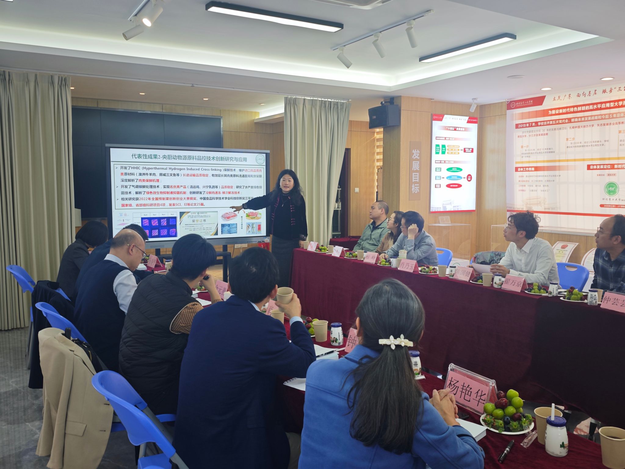 验收会由央厨中心主任肖乃玉教授主持并作建设成效汇报。肖乃玉系统回顾了中心自2021年启动以来的建设成果:已形成7项核心技术,开发12款特色产品,承担国家级、省部级等科研项目40余项,获得各级科技成果奖9项,完成科研成果对外技术转让或许可19项,实现成果转化16项,获授权发明专利58项,发表高水平学术论文50篇。中心还建成多个研发与中试平台,新增设备总值61.13万元,具备良好的工程技术研发、试验验证与成果转化能力。肖乃玉同时分析了当前存在的问题与挑战,并提出下一阶段的工作思路与发展展望。