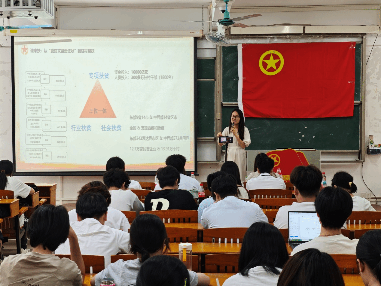 吴晓瑜为同学们讲授了《一起来学脱贫攻坚精神》主题党团课。她以林木盗窃法案为切入点,深刻阐释了脱贫攻坚对于国家发展的重大意义。通过回溯中国在不同历史阶段的反贫困探索,结合全面脱贫攻坚战的战略部署,生动解读“扶持谁,谁来扶,怎么扶,怎么退”四个问题、“五个一批”工程等内容,深入剖析脱贫攻坚精神的丰富内涵。最后以“挑战杯”、“三下乡”和西部计划为依托,展现新时代青年践行脱贫攻坚精神、助力乡村振兴的生动实践,激励同学们勇担时代使命,以青春力量报效祖国。