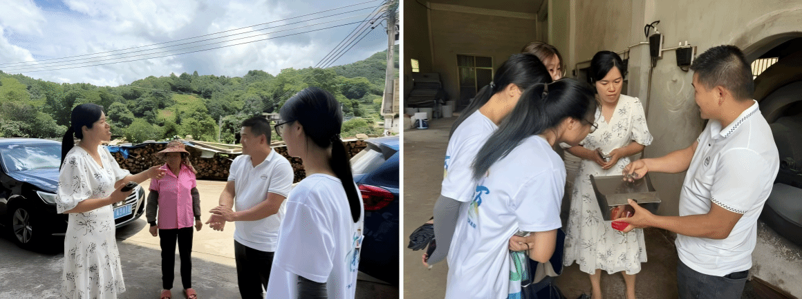 团队实地探访吉坪村鸡心山茶场。2000亩的生态茶园产量品质俱佳。队员们深入参观了茶园,学习客家炒绿工艺。茶场负责人徐喜就表示:“年轻人用专业知识帮我们找问题、想办法,茶产业的未来更有盼头了!”茶产业已成为吉坪村乡村振兴的重要支柱。