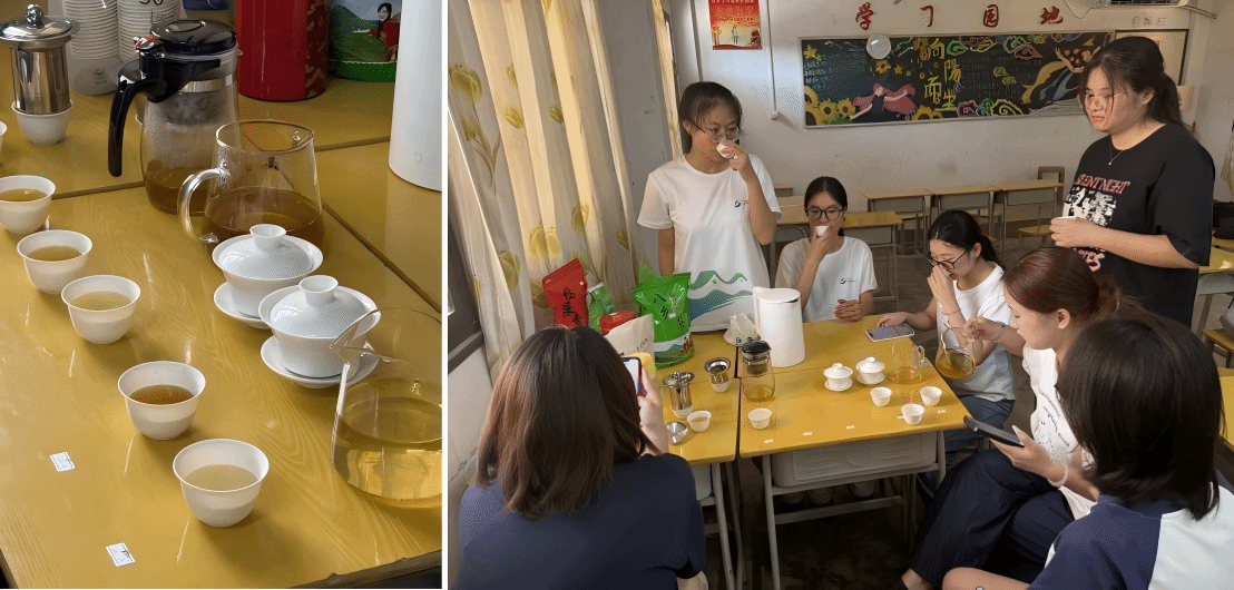 为客观评价客家绿茶品质,团队在丰顺县职业技术学校举办“客家绿茶品鉴会”。队员们运用专业知识,组织学生通过“盲品打分+品鉴猜茶”的形式,从外形、汤色、香气、滋味、叶底五维度,对客家绿茶、英德红茶、潮汕单丛进行打分与感官评审,为优化产品及标准化生产提供了科学数据支撑。
