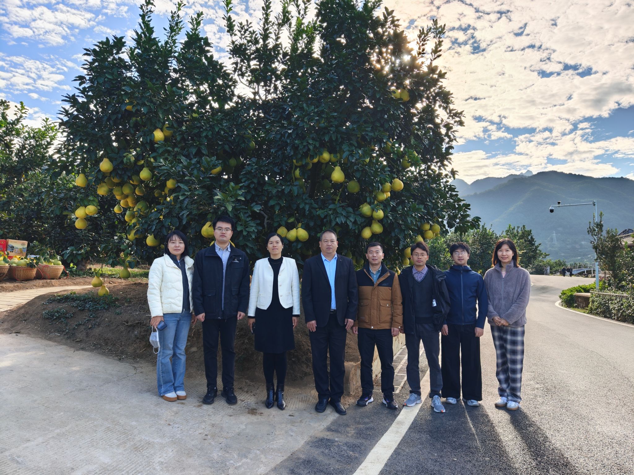 活动首日,学院党委一行走进梅州市雁洋镇南福金柚种植基地开展调研。作为粤东地区特色农业示范点,该基地近年来积极推广生态种植技术,持续推动产业提质增效,已成为区域农业高质量发展的典范。调研过程中,刘胜洪书记与种植户深入交流,详细了解金柚的种植规模、病虫害防治及电商销售等情况;董浩博士从专业角度对金柚标准化生产流程提出优化建议;费永涛博士与李光辉博士则围绕金柚食品加工技术,与企业代表展开探讨。随后举行的座谈会上,学院与雁洋镇有关领导就进一步深化产学研合作进行了充分沟通。