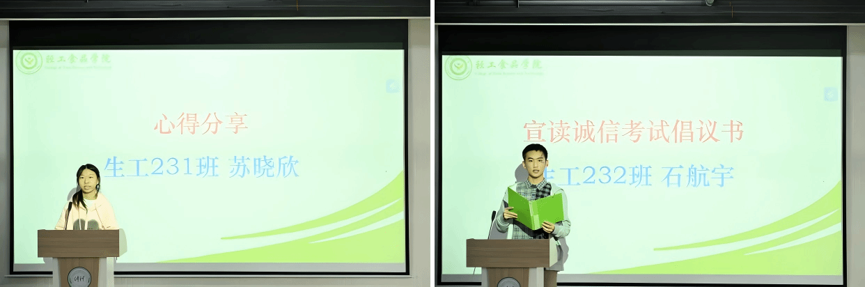在交流分享环节,生工231班苏晓欣同学结合自身参与学科竞赛、科研训练与学风建设活动的经历,分享了关于高效学习、时间管理与综合素质提升的心得体会。随后,生工232班石航宇同学代表学院学生会,面向全体同学庄严宣读了《诚信考试倡议书》,号召大家端正考风考纪,以真才实学接受检验,共同守护公平公正的考试环境,将诚信品格践行于求学始终。