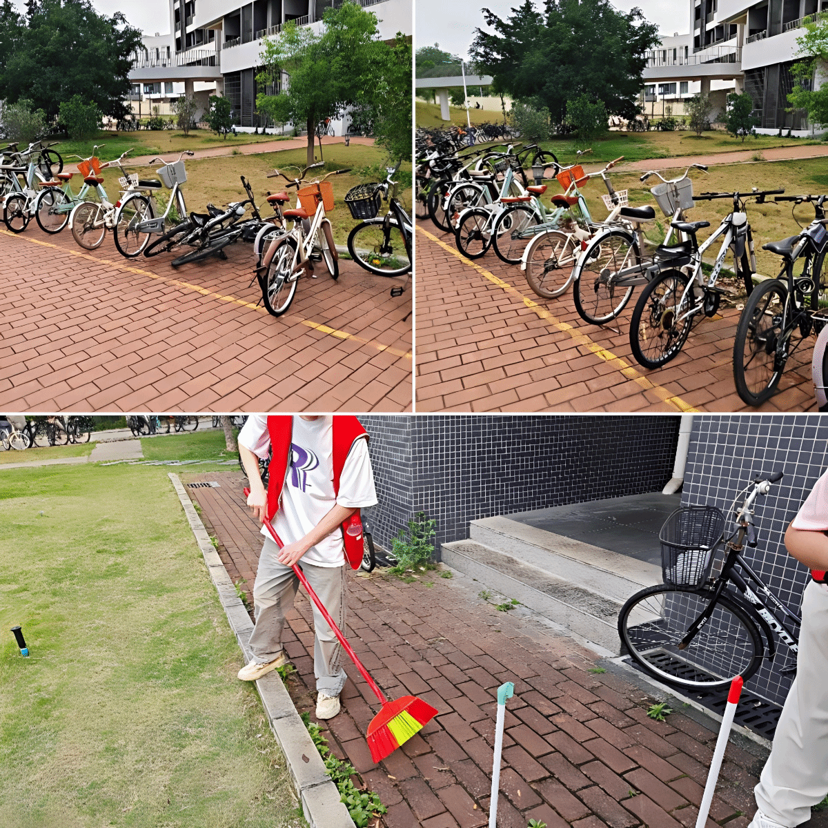活动前期,学院青协通过线上招募方式顺利征集志愿者,并明确告知集合时间、地点、工作内容及相关注意事项,提醒志愿者自行携带扫把、垃圾铲等清扫工具,为活动有序开展打下坚实基础。活动现场,志愿者们手持清扫工具,对路面落叶、角落杂物等进行全面清理。过程中,志愿者们不仅专注于垃圾清运,还主动整理杂乱停放的自行车,将倾斜、无序摆放的车辆逐一归位。经过1个多小时的通力协作,清扫工作圆满完成,19-22栋周边路面干净整洁,自行车停放井然有序,校园环境面貌焕然一新。